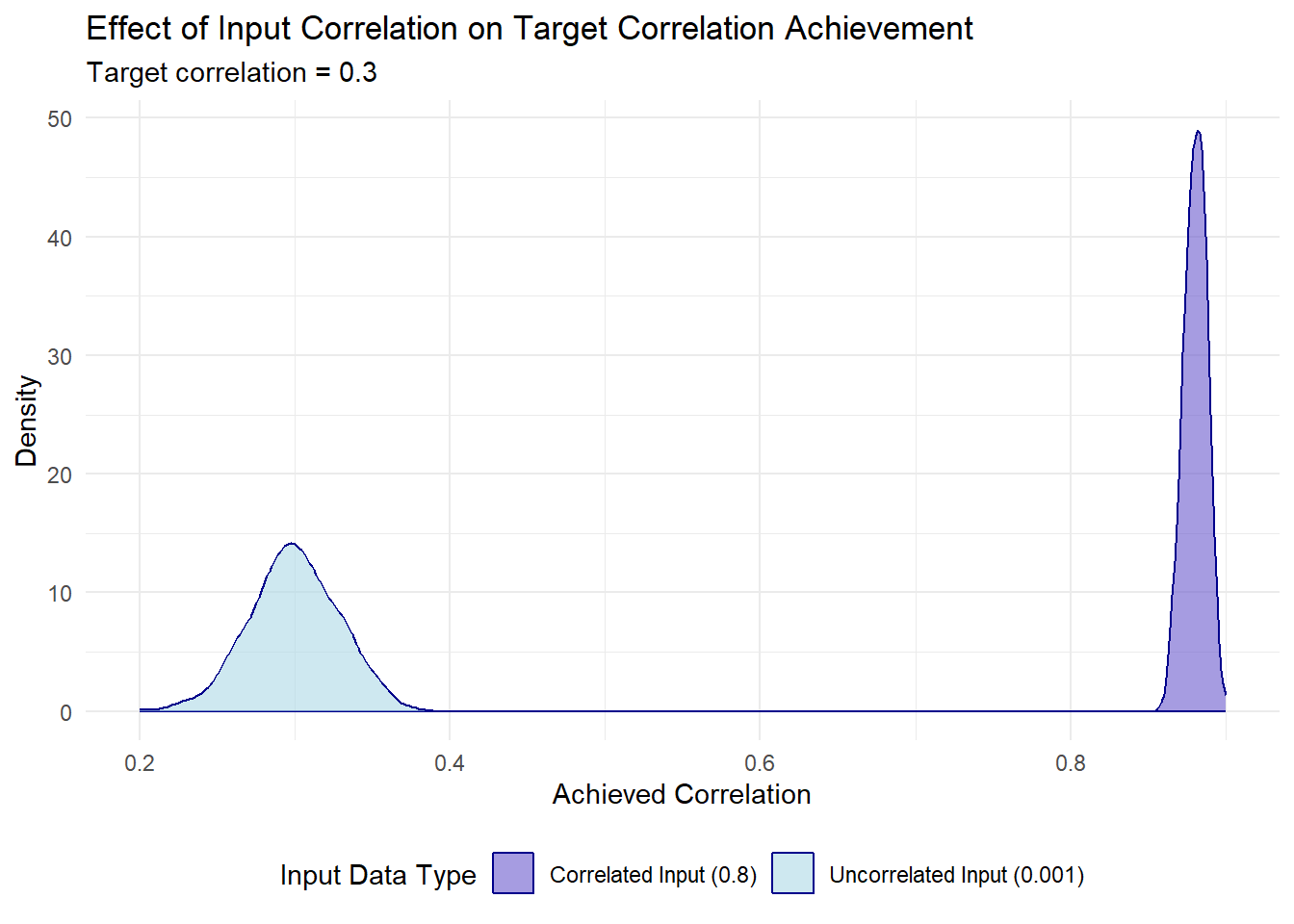 # What happens with already correlated input?simulate_correlation <-function(input_correlation, target =0.3) { results <-replicate(1000, {# Create input with specified correlation x <-rnorm(1000) y <- input_correlation * x +rnorm(1000, sd =sqrt(1- input_correlation^2))# Apply our method old_random <-cbind(x, y) chol_mat <-chol(matrix(c(1, target, target, 1), ncol =2)) new_random <- old_random %*% chol_mat# Return resulting correlationcor(new_random)[1,2] })return(results)}# Compare results with different input correlationscorrelated_results <-simulate_correlation(0.8, target =0.3)uncorrelated_results <-simulate_correlation(0.001, target =0.3)# Create data frame for ggplot2plot_data <-data.frame(correlation =c(correlated_results, uncorrelated_results),input_type =factor(rep(c("Correlated Input (0.8)", "Uncorrelated Input (0.001)"), each =length(correlated_results))))# Create density plot with ggplot2ggplot(plot_data, aes(x = correlation, fill = input_type, color = input_type)) +geom_density(alpha =0.6) +labs(title ="Effect of Input Correlation on Target Correlation Achievement",subtitle ="Target correlation = 0.3",x ="Achieved Correlation",y ="Density",fill ="Input Data Type",color ="Input Data Type") +theme_minimal() +theme(legend.position ="bottom") +scale_fill_manual(values =c("slateblue", "lightblue")) +scale_color_manual(values =c("darkblue", "darkblue"))